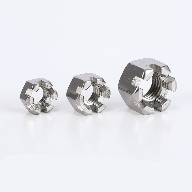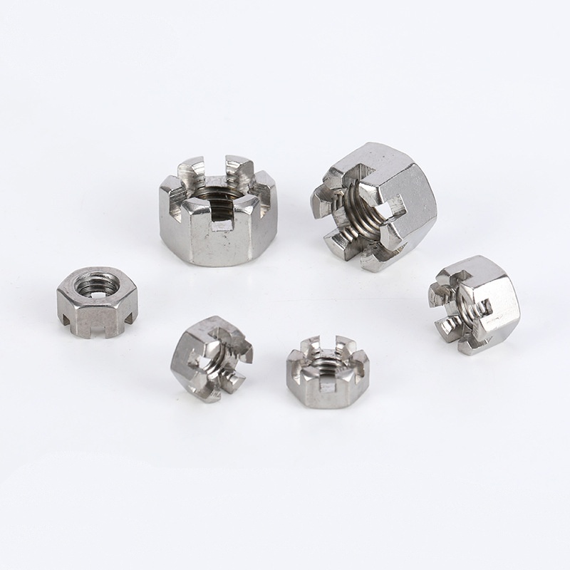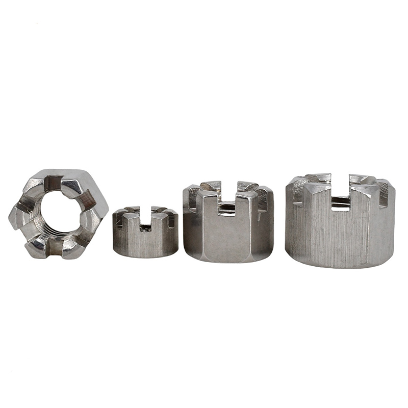 Corrosion အောင်နိုင်သည့်သရဖူကိုရွေးချယ်ခြင်းအတွက်ပစ္စည်းများကိုရွေးချယ်ခြင်းသည် Slot နှင့် Slot နှင့် Slot နှင့်အတူအလုပ်လုပ်ရန်သေချာစေရန်တင်းကျပ်သောစည်းမျဉ်းများကိုလိုက်နာသည်။ သံမဏိအခွံမာများသည် ISO 898-2 (ဖုံးအုပ်ထားသည့်စွမ်းဆောင်ရည်အဆင့် 6, 8, 10 နှင့် 12) နှင့် sae j995 အပါအ 0 င်ပင်မစံချိန်စံညွှန်းများနှင့်ကိုက်ညီနိုင်သည်။ ၎င်းတို့သည် ASTM A194 / A563 ကဲ့သို့သောစံနှုန်းများကိုလိုက်နာကြပြီးအသုံးအများဆုံး application တစ်ခုအတွက်သင့်တော်ပါသည်။ သံမဏိသူများသည် AISI 304/316 သို့မဟုတ် ASTM F594 ကိုသုံးပါ။ ခက်ခဲတဲ့ Aerospace အလုပ်များအတွက်သူတို့ဟာ A286 ဒါမှမဟုတ် Inconel 718 လိုမျိုးစွမ်းဆောင်ရည်မြင့်တဲ့သတ္တုစပ်တွေကိုသုံးတယ်။ Slotted သရဖူကိုအခွံမာသီး၏ပစ္စည်းသည်၎င်း၏စွမ်းအားအညွှန်းကိန်း,